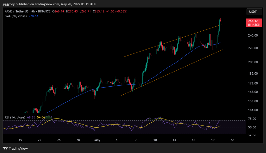 AAVE价格近期表现强劲,过去24小时内涨幅超过22%,截至发稿时价格已攀升至约264.80美元。交易量也大幅增加,涨幅超过60%,显示出大量投资者正在涌入。AAVE成为今日市场涨幅最大的加密货币。