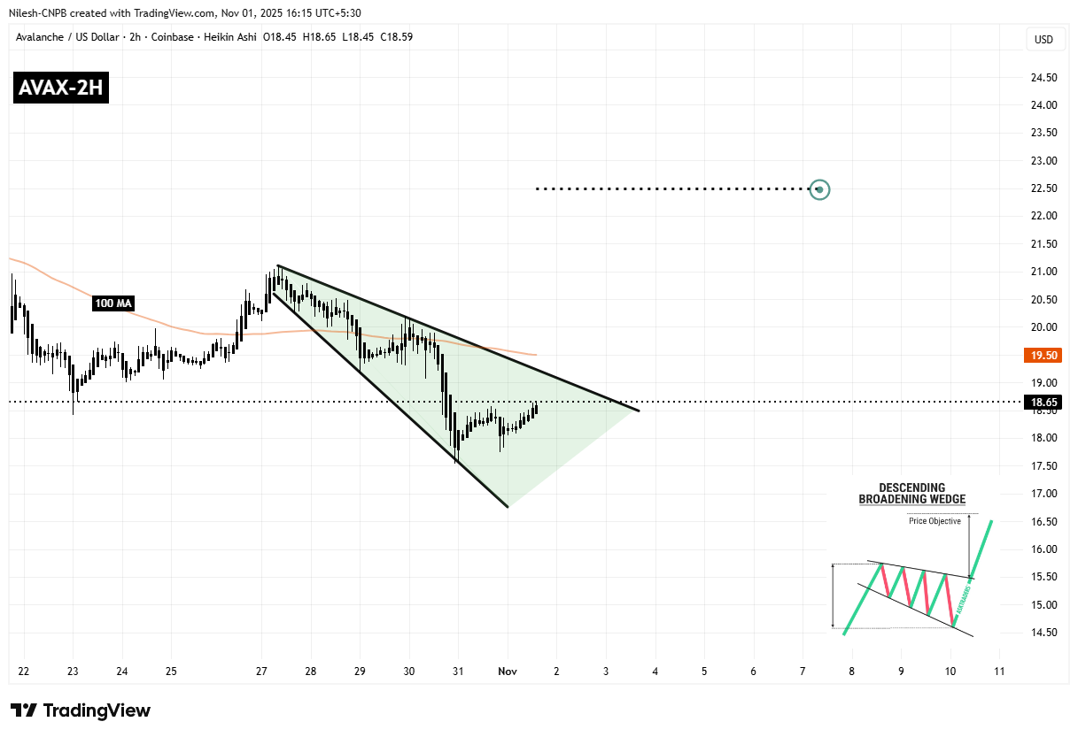 在2小时图上,AVAX始终在一个下降扩散楔形区间内交易——这种看涨技术形态通常出现在下跌趋势中,当价格向上突破时往往预示着趋势逆转可能。