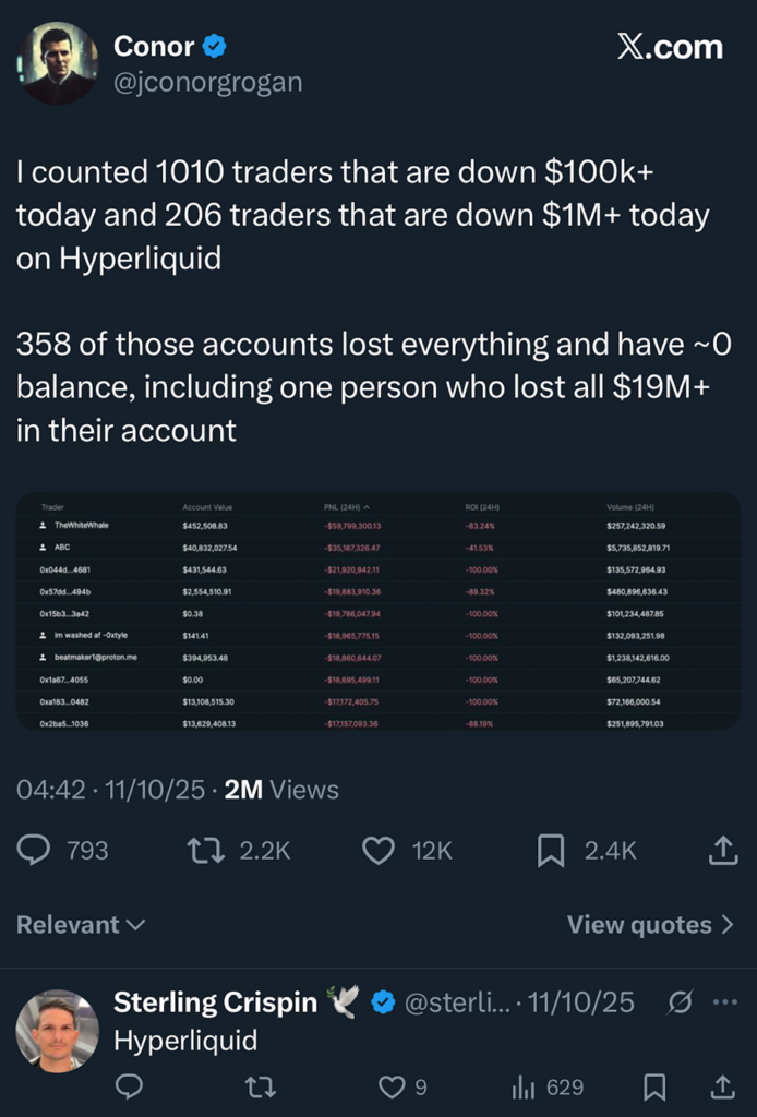 Paradex上发生的事件在加密领域并非首次。2025年10月,Hyperliquid曾遭遇加密史上最大规模的清算潮。在市场快速下跌期间,仅该平台就有超过100亿美元的仓位被强制平仓,部分交易者在几秒钟内损失一切。