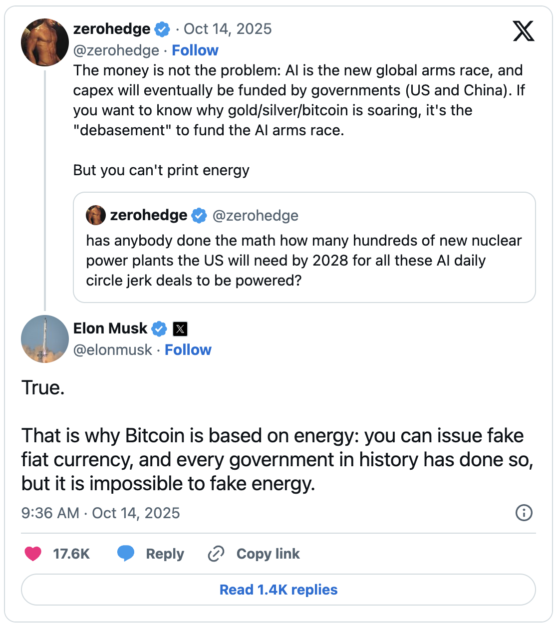 这种沉默持续至2023和2024年。但随着2025年最后一季度临近,马斯克打破了沉默。他在回复知名X用户ZeroHedge时,认同"中美AI竞争导致全球政府支出激增会引发货币贬值"的观点。其"确实"的评论强调,相比法币体系,比特币基于能源的结构更具抗操纵性。