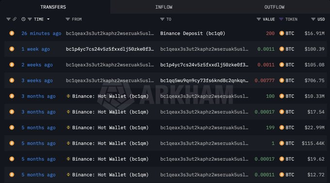 Lookonchain将此次抛售与市场暴跌窗口及快速转账联系起来。其截图显示200枚比特币转移到了一个币安存款地址。该帖文暗示了行动的紧迫性,而非计划内的分发。