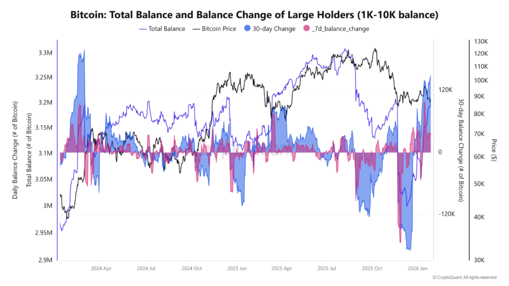另一份链上总结描述了一个不同的巨鲸群体。该总结追踪了持有1,000至10,000枚比特币的地址,指出这些钱包的持仓已增至约320.4万枚比特币。