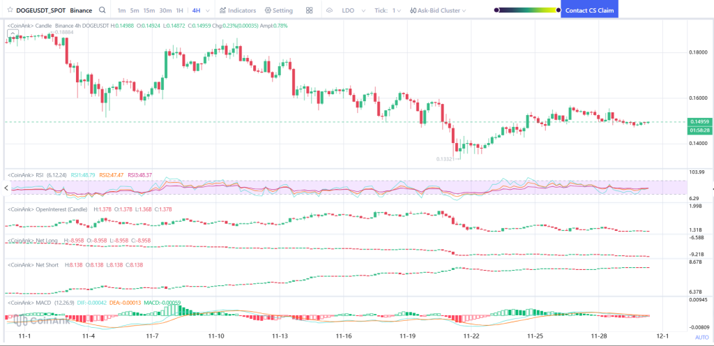 从四小时图观察,狗狗币价格在0.149美元附近徘徊,较十一月上旬0.18美元区域明显回落。图表显示价格正处于横盘整理阶段,月中出现的抛压已逐渐消散。此前下探0.133美元的急跌形成了本月关键支撑位,而DOGE始终坚守该防线。尽管价格随后缓慢回升,但相较于其他大盘币种仍显乏力。