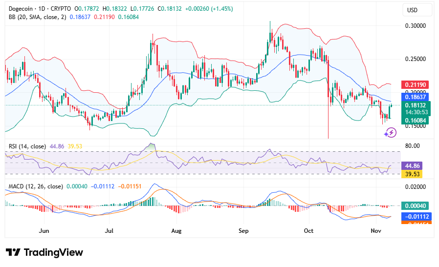 当前狗狗币交易价格低于20日简单移动平均线(0.186美元),但距离布林带上轨0.2119美元并不遥远。当价格接近下轨时,部分分析师认为这可能预示价格即将修正。