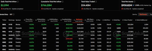 12月31日,美国Solana现货ETF市场录得229万美元单日净流入,累计流入达7.662亿美元。