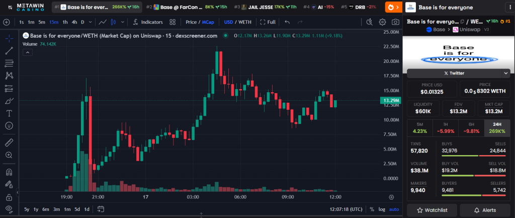 尽管Base明确澄清这不是官方代币,仅用于创意目的,但市场却做出了不同解读。交易者将该帖子视为机构支持的信号,推动Base is for everyone代币市值在几分钟内飙升至1300万美元。