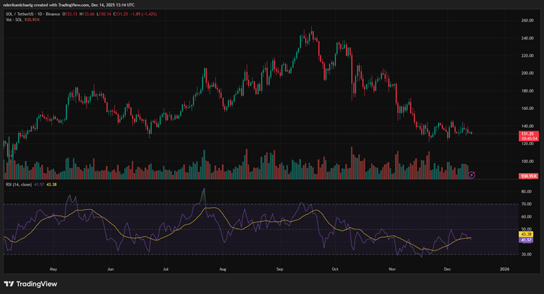 尽管SOL价格处于明确震荡区间,短期价格波动仍主导市场走向。宏观因素带来的长期不确定性导致SOL近三周维持窄幅波动。本周中段的回调印证需求疲软——RSI指标未能突破50%中线,反映当前买盘力量依然薄弱。