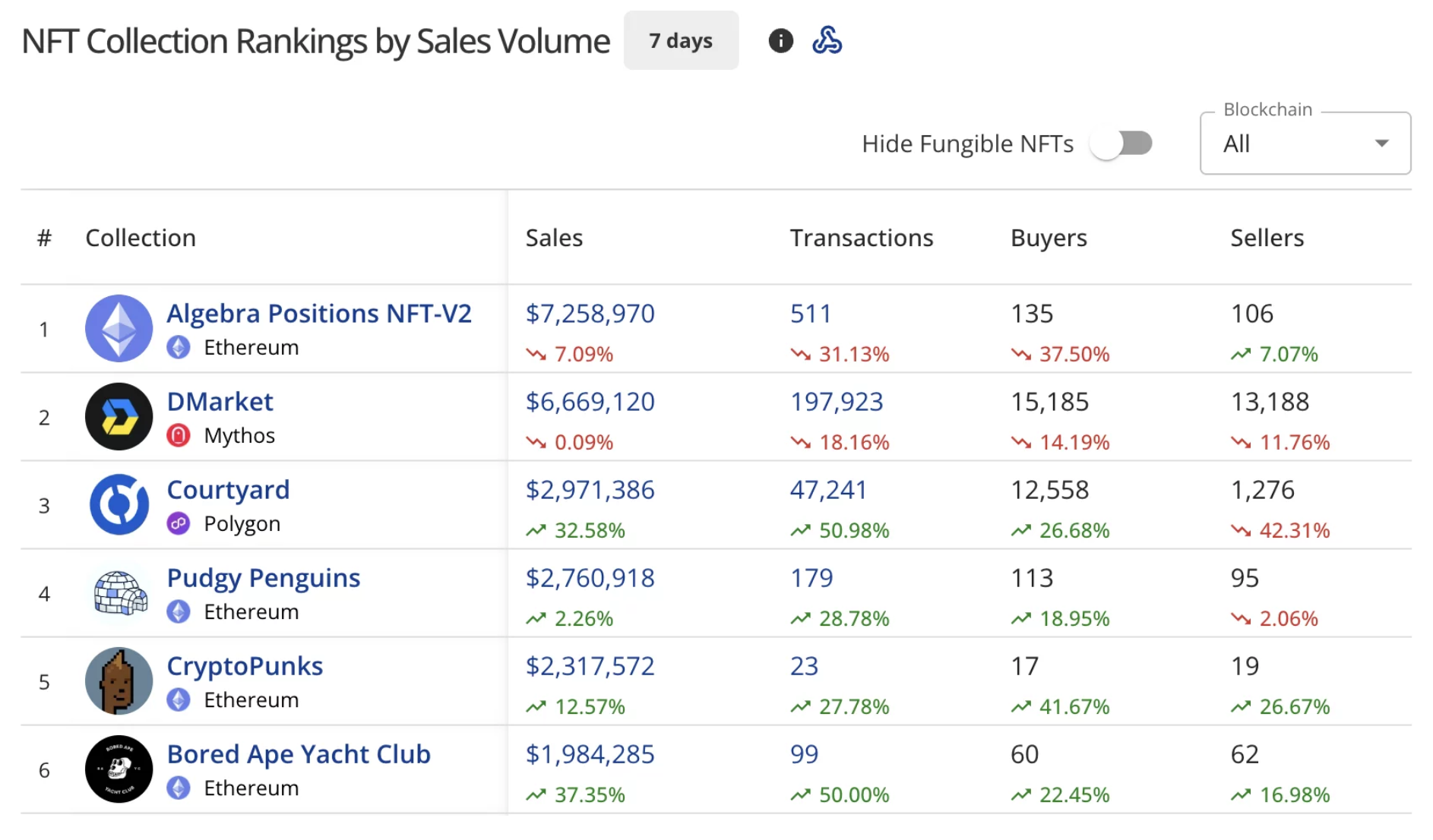 尽管市场动荡,最畅销的NFT藏品仍保持了其地位。在以太坊网络上,Algebra Positions NFT-V2以726万美元的销售额领先,尽管较前一周下降7.09%,完成了511笔交易,但仍保持领先地位。