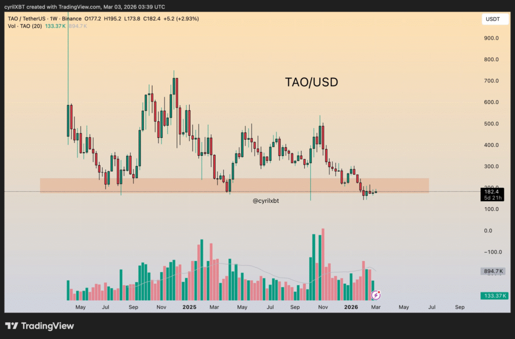 据分析师Cyril-DeFi观察,TAO在回调至170-200美元长期需求区后,现报182.40美元,日内上涨2.93%。周线图显示价格在持续下跌后进入震荡整理,成交量下降暗示资金积累而非趋势延续。