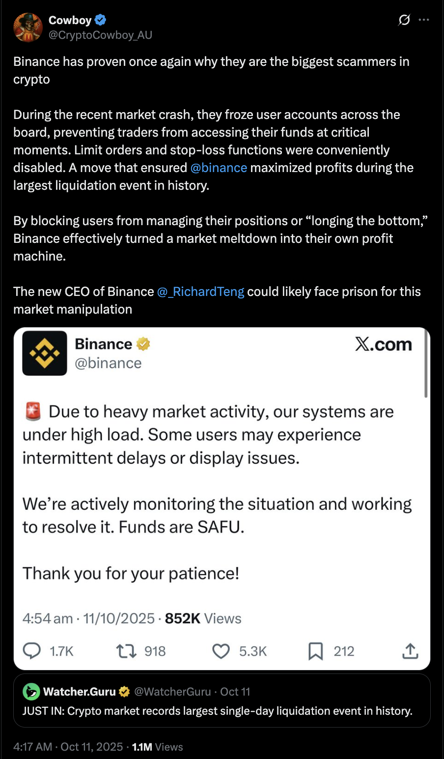 币安联合创始人何一承认存在问题:"在极端波动和平台流量激增情况下,部分用户遇到交易问题。"CEO Richard Teng致歉称:"我们不做辩解,将从中吸取教训改进平台稳定性。"