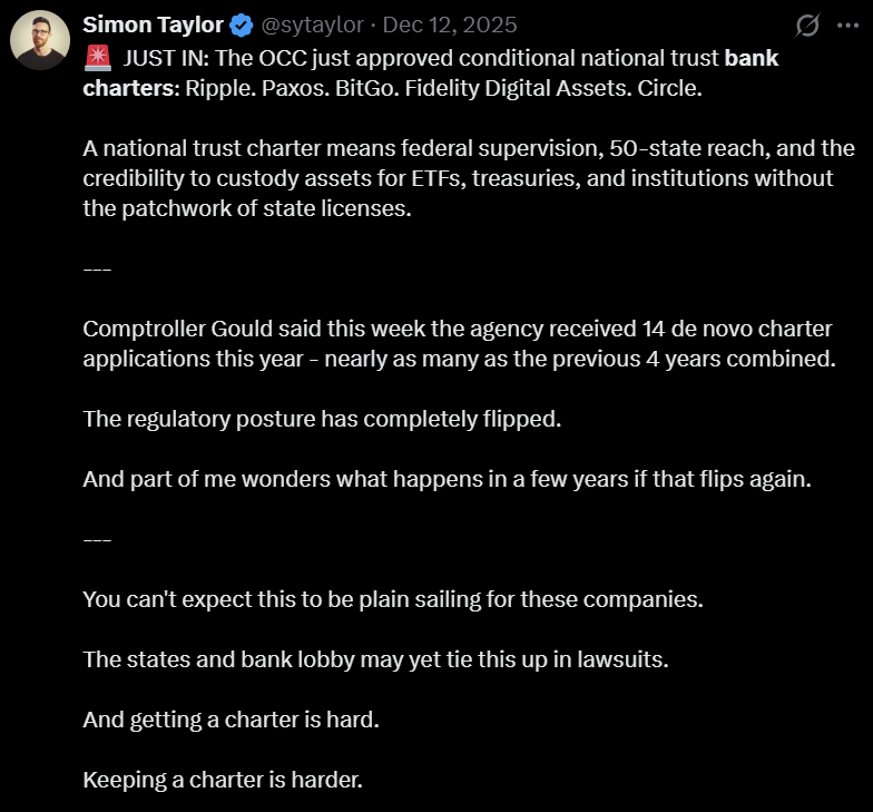 探索阶段已逐步转化为具体监管行动。去年12月,货币监理署有条件批准了五家数字资产公司的国家信托银行牌照,包括与Circle关联的First National Digital Currency Bank、Ripple National Trust Bank、BitGo Bank & Trust、富达数字资产以及Paxos Trust Company。