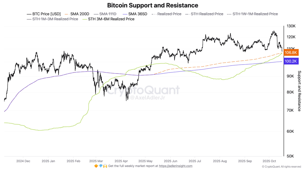 比特币坚守10.6万美元关键支撑区,该位置与200日均线及实现价格重合。