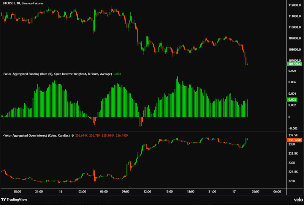 币安期货数据显示BTC曾跌至106,705美元,资金费率降至0.003%反映多头兴趣减弱。未平仓合约反而增至23.61万BTC,显示交易者正在加仓布局。