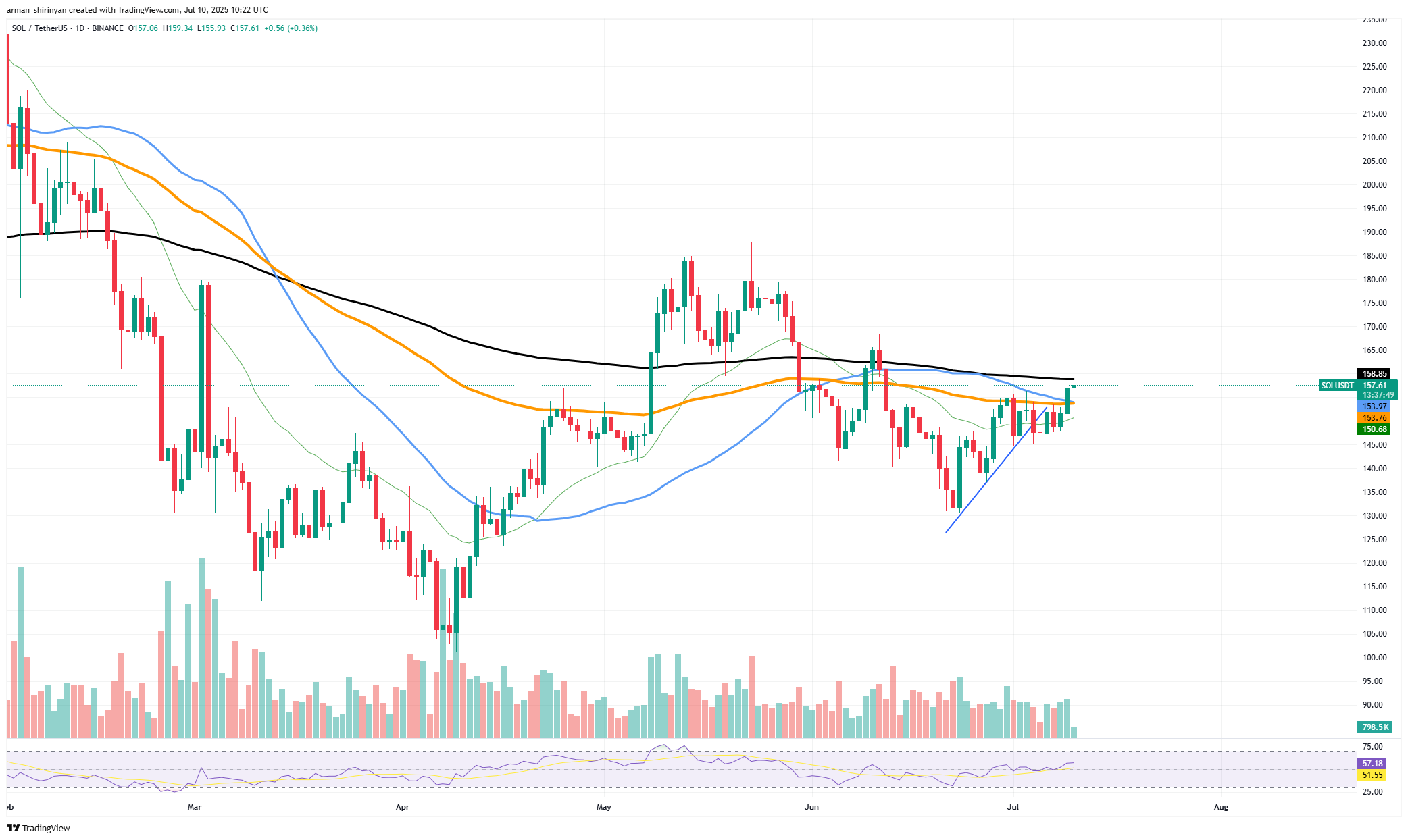 当前SOL价格正试图突破155-165美元阻力区间的交汇点,在关键移动平均线下方持续盘整。从技术面看,Solana自6月低点逐步回升,形成更高低点,并向160美元水平收复失地。成交量分析显示市场参与度稳定——尽管相比4-5月的脉冲式上涨稍显乏力。