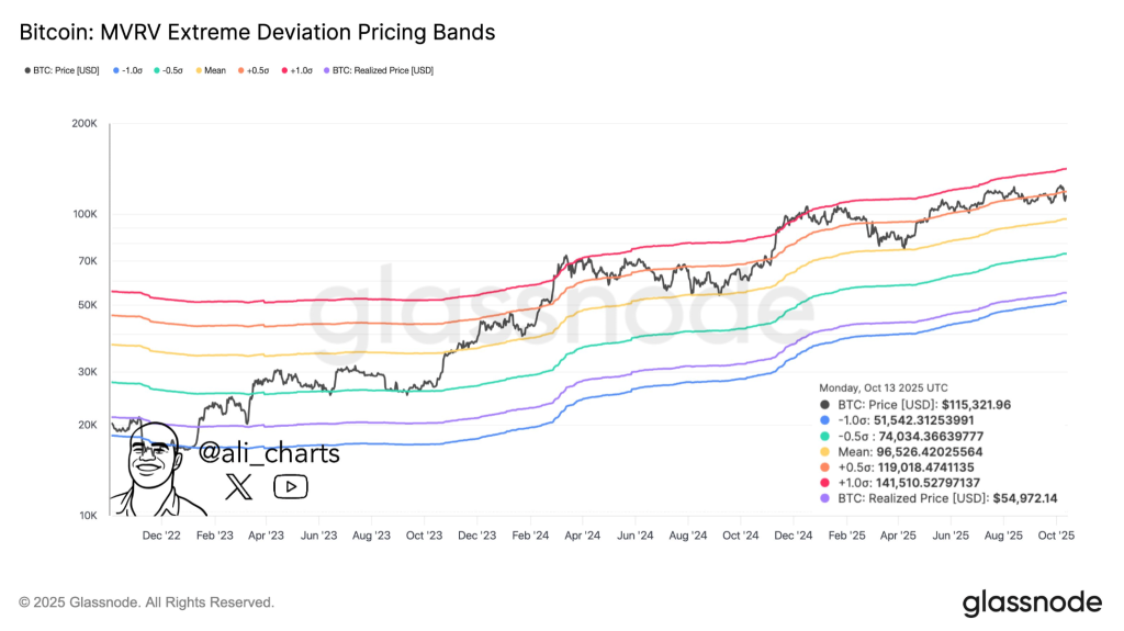 若短期内无法收复11.9万美元,下一支撑位将下移至96,526美元的平均定价带。该区域在动能不足阶段常引发短期盘整或市场重置。尽管回调,比特币仍远高于54,972美元的实现价格,表明长期持有者盈利,为市场信心提供缓冲。