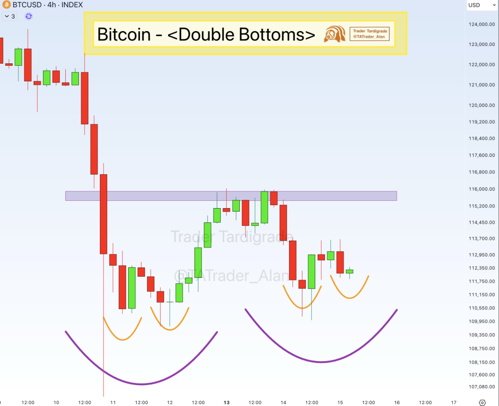 4小时图上,分析师Alan指出比特币可能正在形成双底反转形态。该形态包含110,500美元附近的更高低点,显示该区间买家兴趣增长。