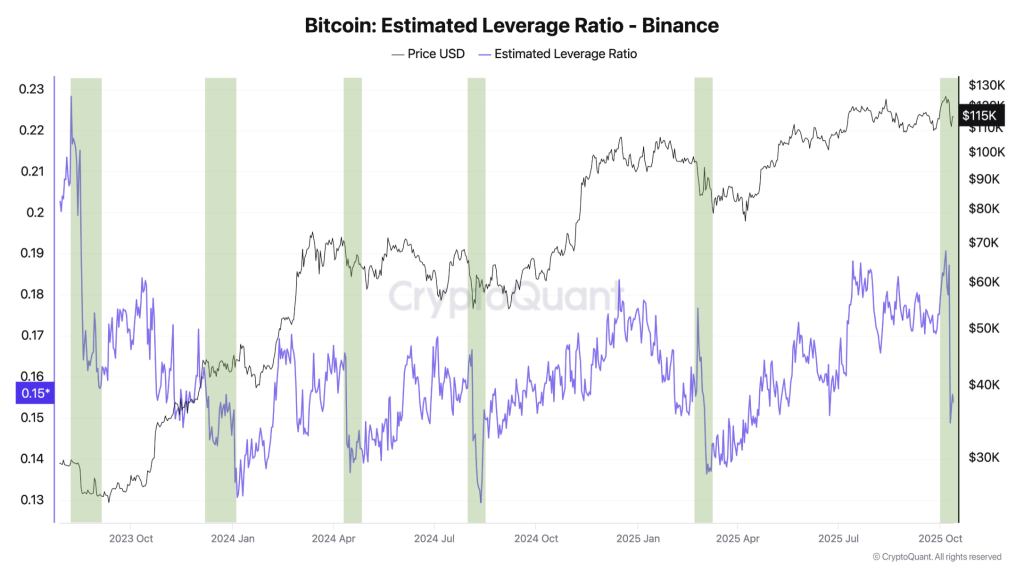 颈线位位于11.6万美元附近,突破后可能上探12-12.2万美元区间。但若跌破11万美元将破坏形态,开启更大下行空间。CryptoQuant数据显示,币安平台比特币预估杠杆率(ELR)从0.22高位降至0.15,反映近期清算后投机风险降低,市场环境更健康。