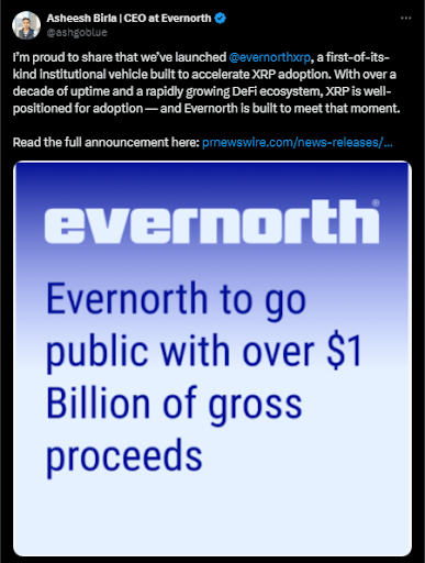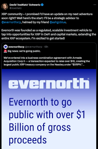 Evernorth已与Armada Acquisition Corp II达成合并协议,拟以XRPN为交易代码登陆纳斯达克。该交易预计于2026年一季度完成,计划募集超10亿美元用于机构级XRP储备及生态建设。分析师指出,此次人事变动显示Ripple管理层与Evernorth新战略高度协同。