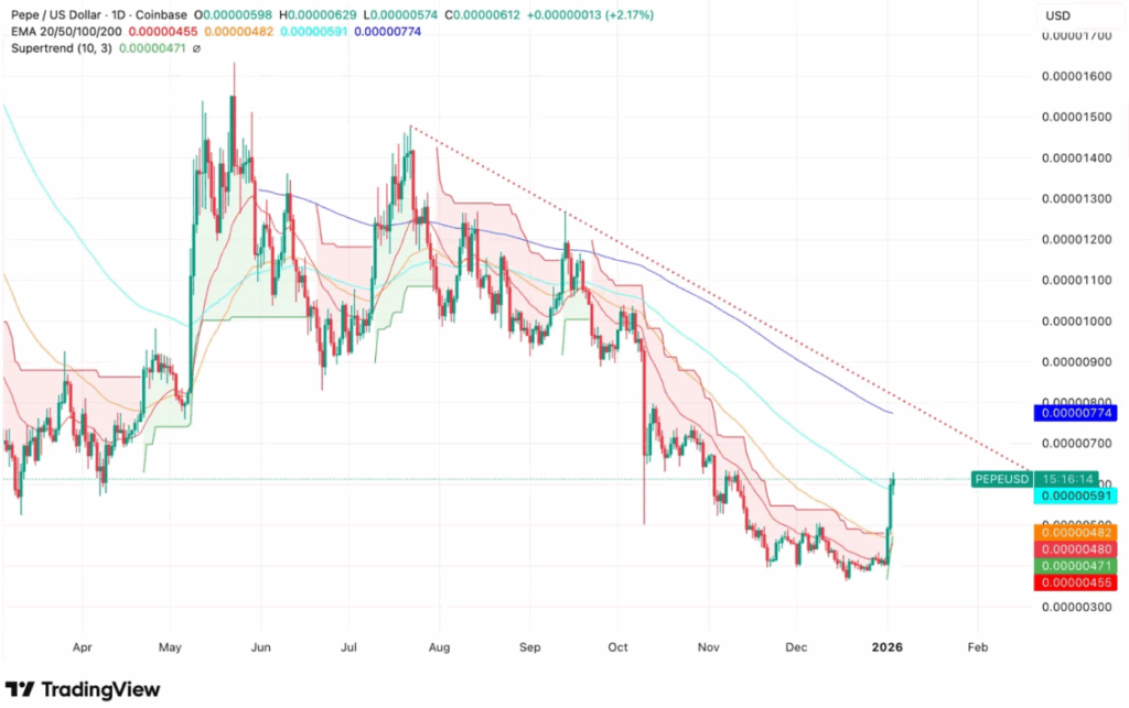 PEPE当前交易价格为0.00000612美元,较2025年5月0.00001600美元的峰值下跌了62%。该代币目前位于所有关键指数移动平均线下方,当前EMA水平位于0.00000455美元至0.00000774美元之间。位于0.00000471美元的看跌超级趋势线表明价格继续面临下行压力。