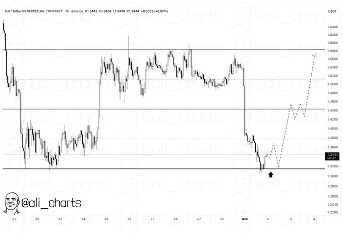 分析师Ali(@ali_charts)指出若该区域坚守,Sui可能重返1.60美元区域。新形成的更高低点结构支持这可能是偏离而非真正突破的判断,而站稳1.33美元上方仍是该观点的核心依据。