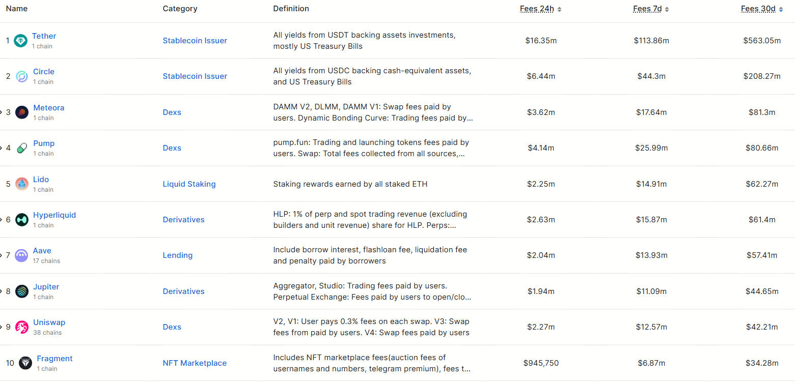 图表显示,DeFi协议获取的手续费份额自2024年中期的持平状态以来已实现大幅增长。DeFiLlama汇编数据显示,目前收益最高的加密产品排名已被DeFi协议主导——过去30天内前17大收益实体均为应用层协议,而非底层区块链。