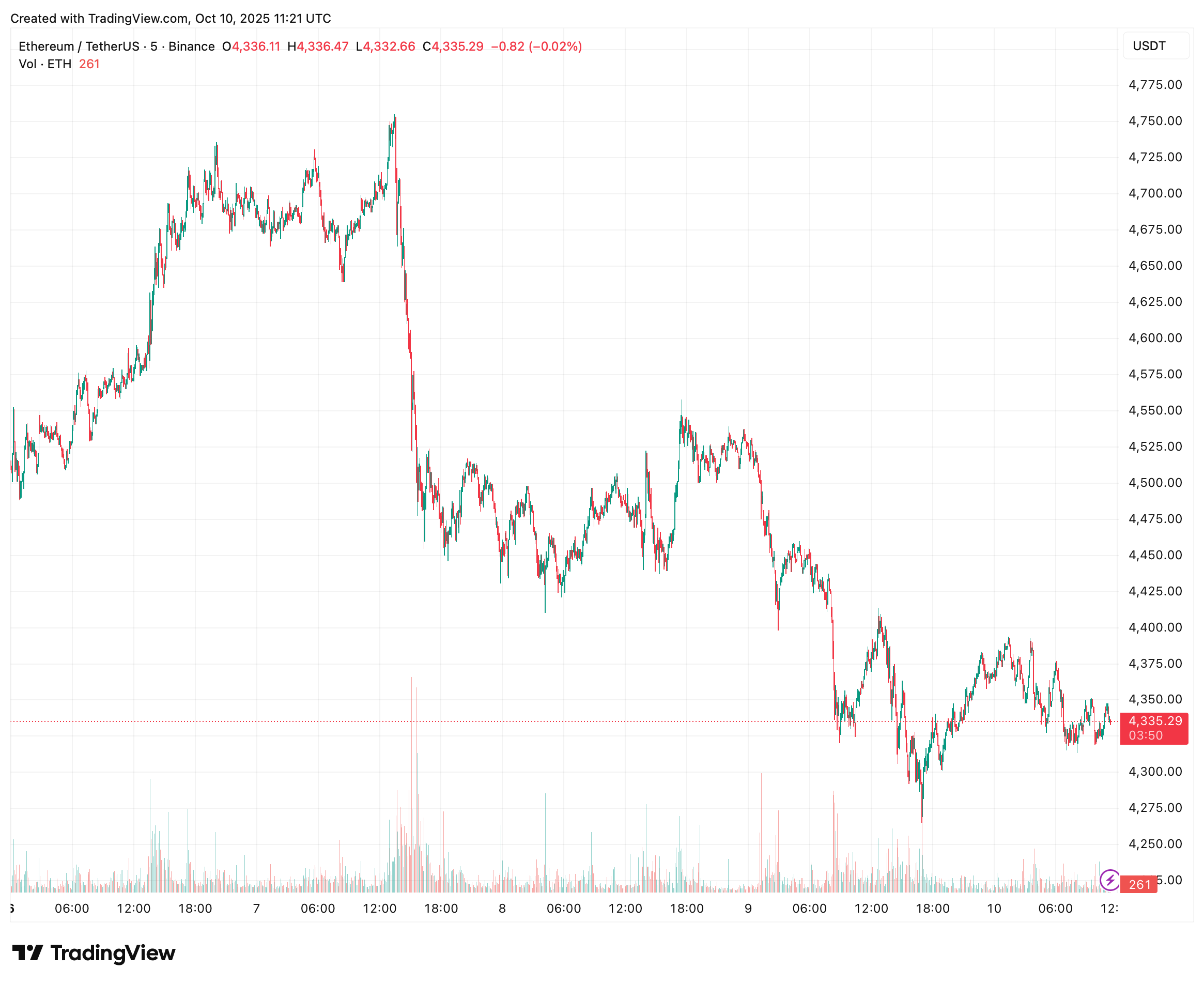 TradingView数据显示,当前以太坊交易价格约为4335美元,周跌幅达3%。尽管出现下跌,但价格走势表明ETH正在4250美元关键水平上方构筑底部——该价位自十月初以来已多次形成有效支撑。