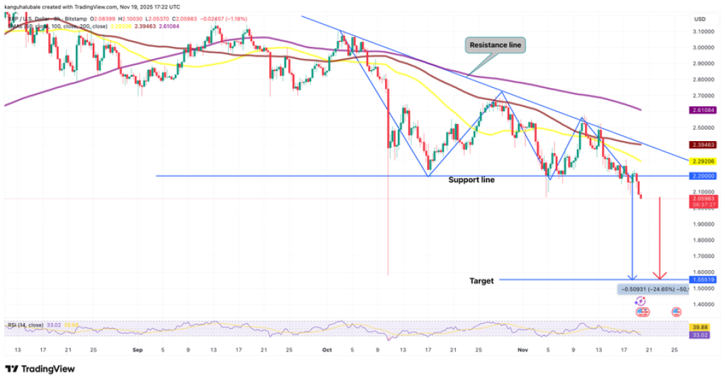瑞波币8小时走势图显示,自10月2日创下3.10美元高点后,逐渐形成下降三角形整理形态。TheCryptoBasic页面特别关注这一技术结构——价格在此区间内震荡数周后,最终于11月17日实现向下突破。在2.20美元附近对下轨的重新测试失败后,进一步回调随之而来。失守该关键区域且未能收复2美元关口,为价格下探1.55美元打开了通道,该位置与潜在12个月低点的预测目标相吻合。