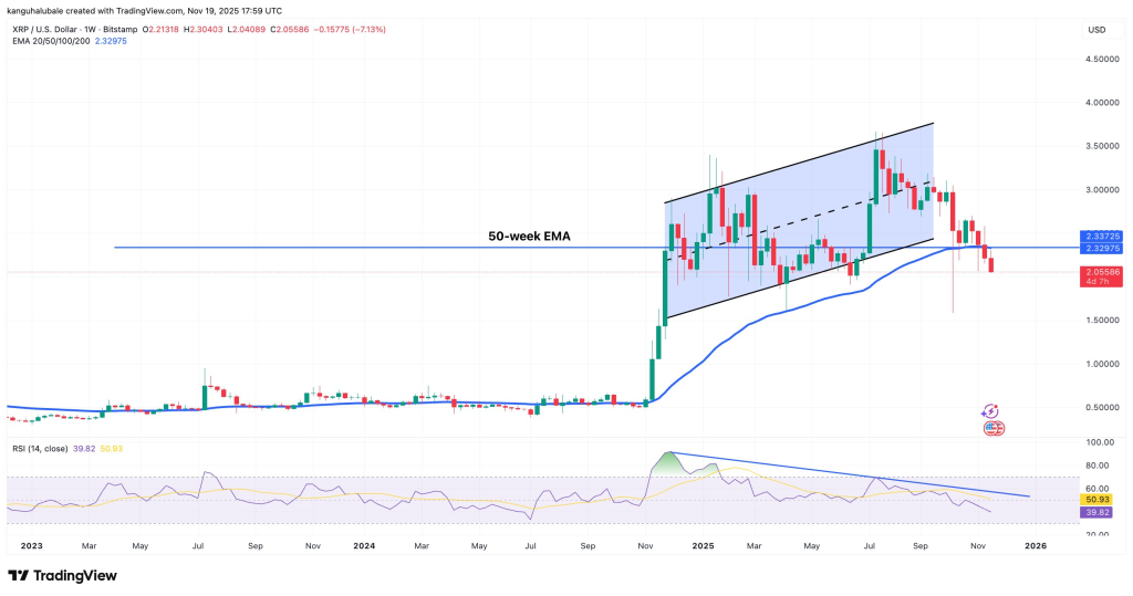 周线图的技术信号同样利空。虽然瑞波币自2024年11月以来始终在上升通道内运行,持续创造更高高点和更高低点,但TheCryptoBasic页面注意到周线RSI指标并未配合这波上涨势头,同期反而形成更低的高点,构筑出看跌背离信号。