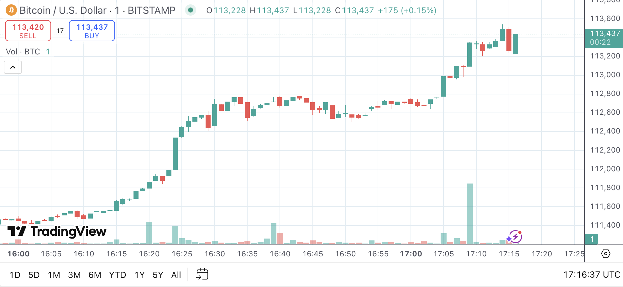 市值排名第一的加密货币比特币于UTC时间17:41在Bitstamp交易所创下113,541美元的历史新高,首次突破11.3万美元关口。