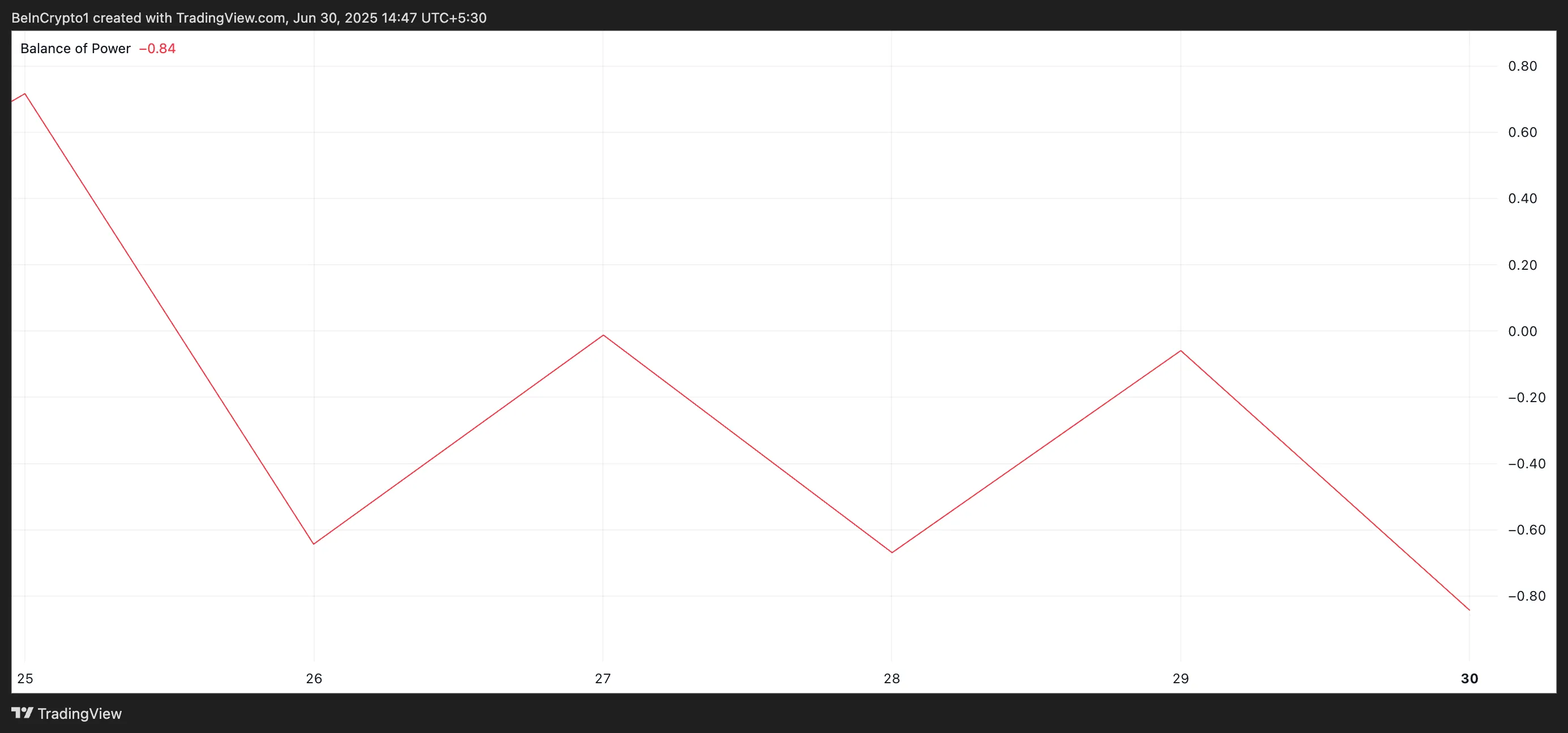 PI/USD日线图显示其平衡能量指标(BoP)值为-0.84,表明