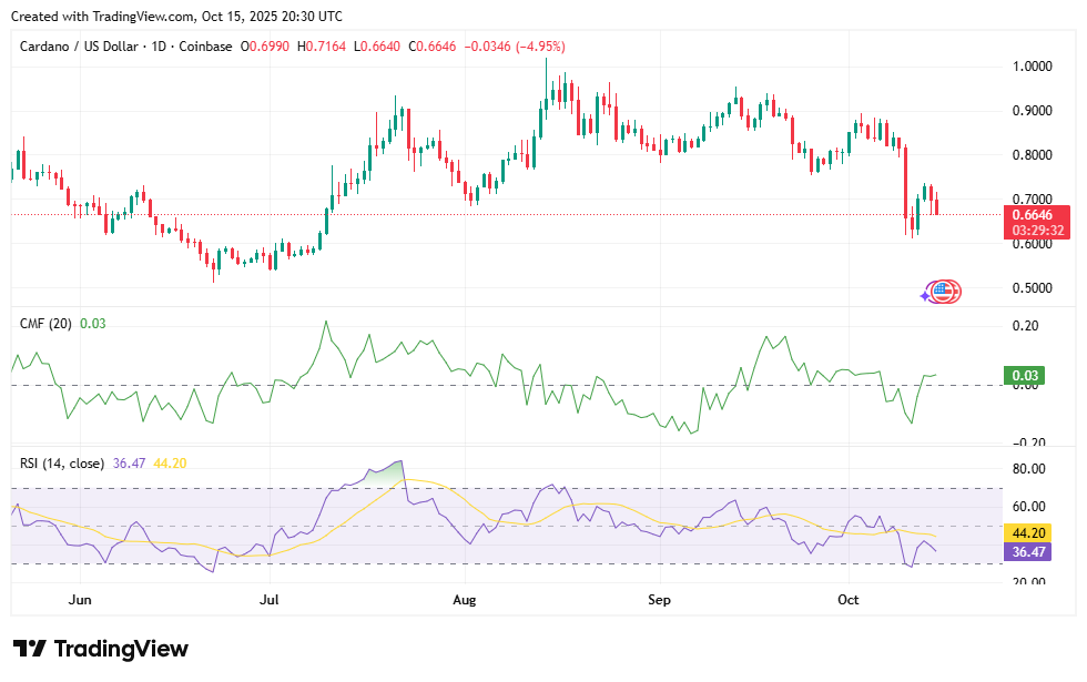 相对强弱指数(RSI)等关键指标显示中性至略微看跌势头,而蔡金资金流量(CMF)接近中性,表明资金外流速度放缓。尽管近期面临巨鲸抛压,ADA图表显示未来数日对其短期走势至关重要。