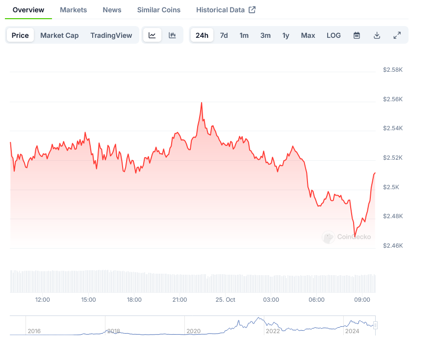 2024年10月25日欧洲早盘时段,以太坊交易价格约为2495美元。尽管市场低迷,日交易量仍达到150亿美元,显示出市场参与度保持活跃。
