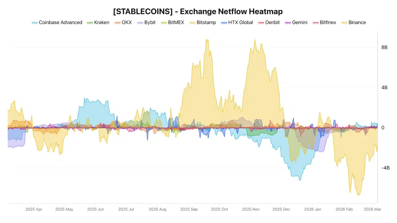 这张稳定币交易所净流入热力图涵盖了2025年4月至2026年3月期间十大交易所的数据。零轴以上的正值表示稳定币正流入交易所,通常意味着买入意图;