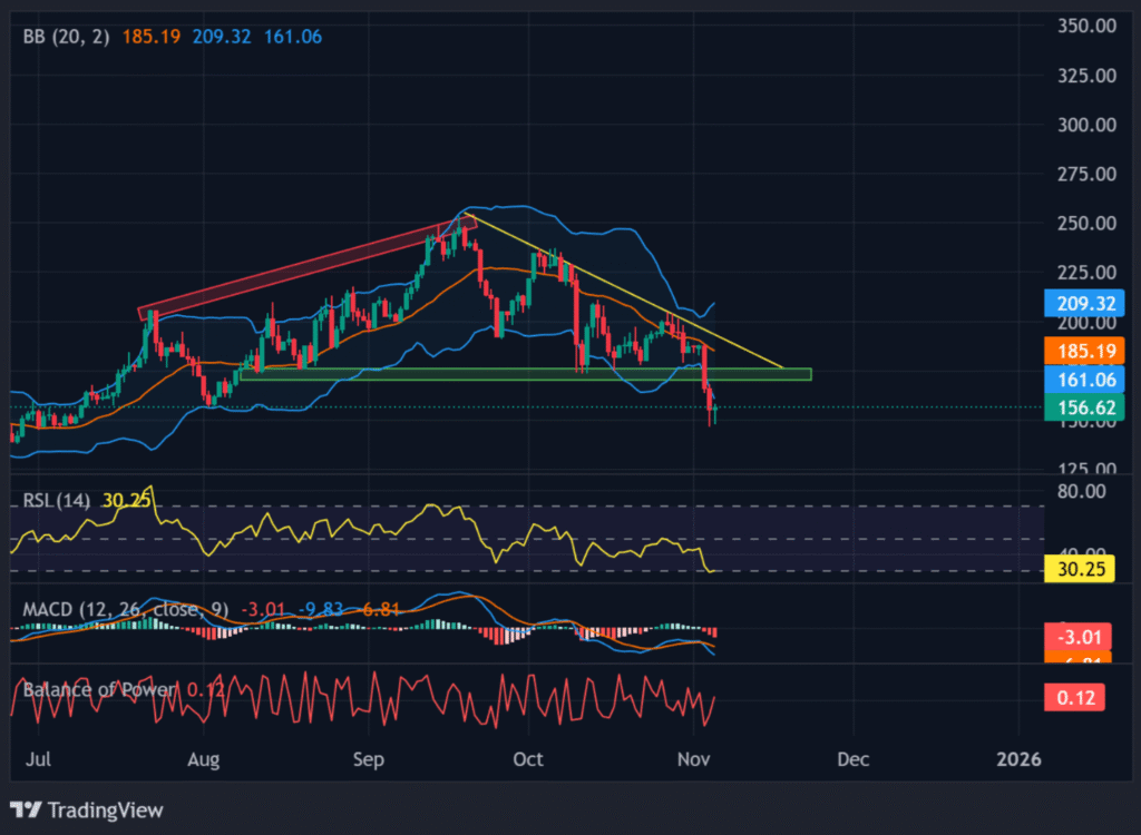 随着交易者转向其他公链,Solana代币价格已跌至156美元附近,接近8月低点。数据显示交易活动正加速流向Hyperliquid和BNB Chain,两者交易量均呈现强劲增长。