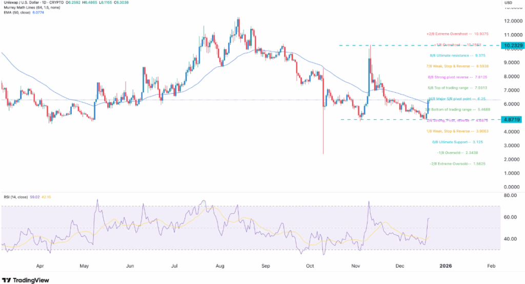 从技术面看,UNI代币从12月18日4.8720美元的月低点反弹至当前6.33美元水平。其形成的双底形态颈线位于10.2美元附近,这种结构通常被视为看涨信号。该代币同时突破了下降楔形形态并站上50日指数移动平均线。相对强弱指数攀升至60,支持价格继续上探7.81美元阻力位的动能预期。