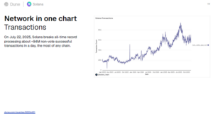 Solana达成了年度最引人注目的里程碑之一。2025年7月22日,其单日成功处理约9400万笔交易,超越所有其他链的历史记录。这一性能支撑了高频交易、专业流动性提供者及大规模DeFi活动。