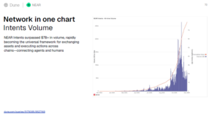 NEAR与意图概念:NEAR专注于意图概念,这一框架使跨链活动更简化。至2025年,意图处理量超70亿,出块时间降至600毫秒,网络保持了5年100%正常运行时间。