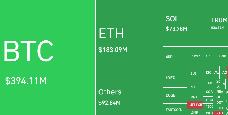 Coinglass数据显示,过去24小时杠杆仓位爆仓达9.94亿美元,其中多头清算8.95亿美元。比特币以3.94亿美元强制平仓领跌,以太坊以1.83亿美元紧随其后。