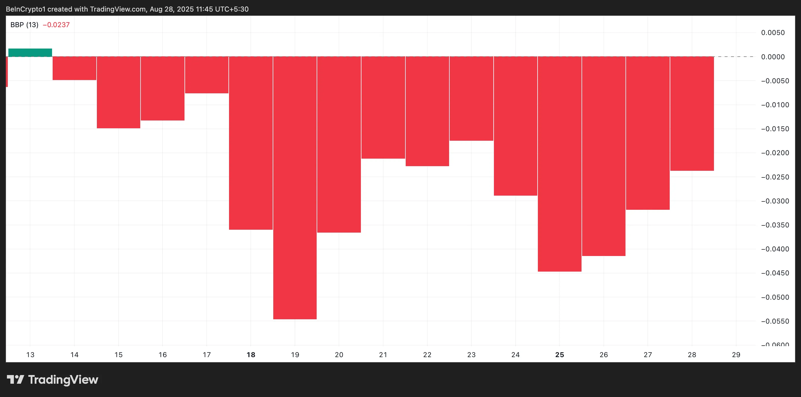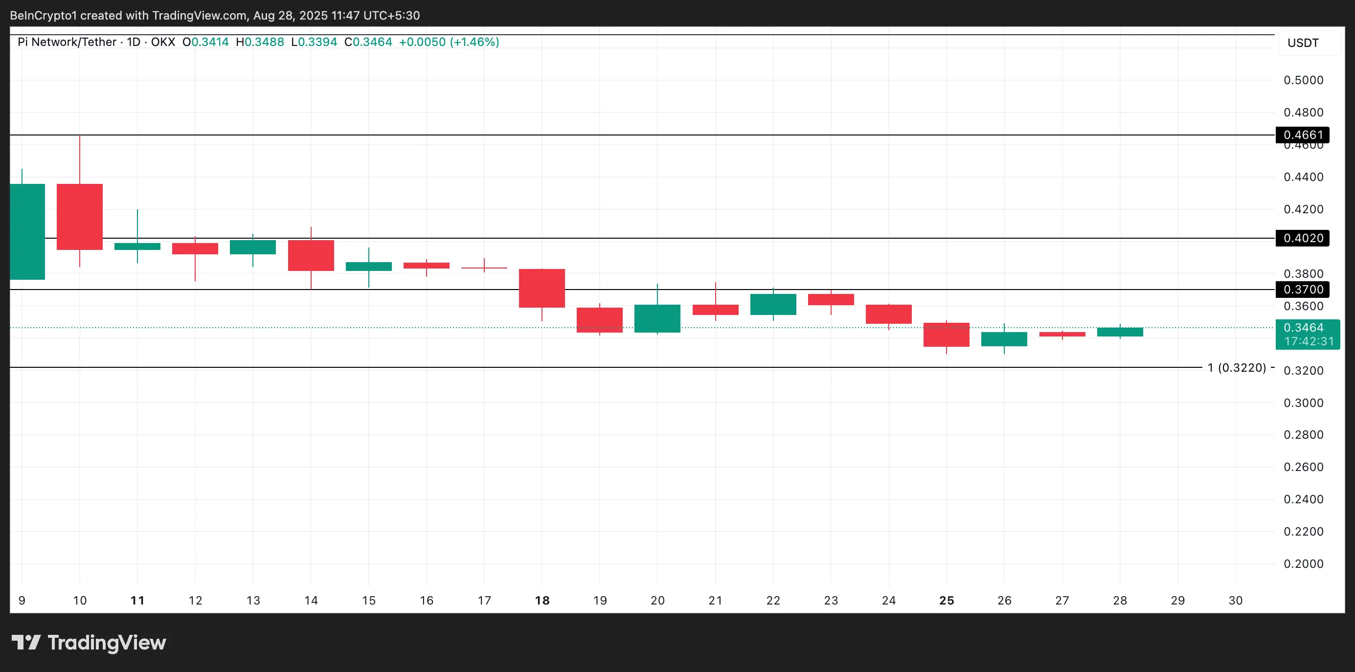 Elder-Ray指数用于衡量市场中买方(牛力)与卖方(熊力)的力量对比。负值表明空方占优,意味着抛压超过买入兴趣。自8月14日以来,PI的Elder-Ray指数持续呈现负值,突显市场情绪长期低迷。这种持续的看空读数反映出该代币在吸引需求方面面临挑战。