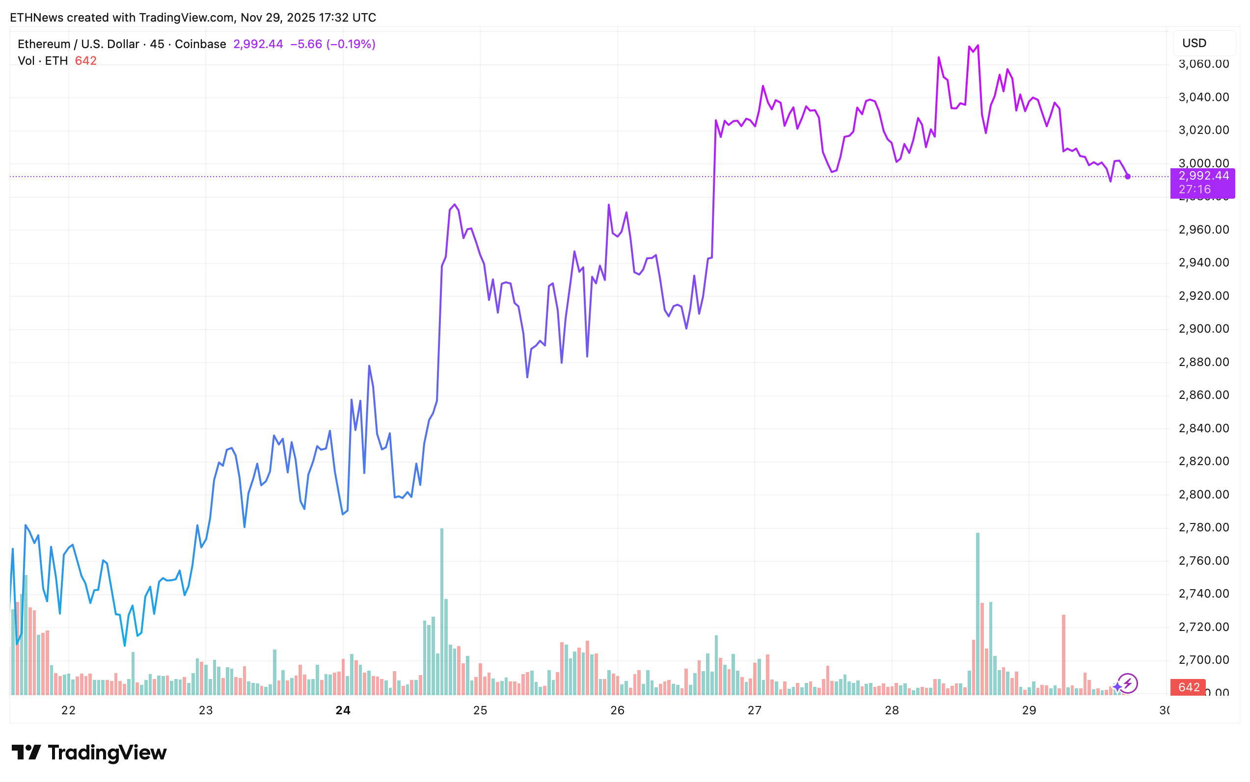 短期(45分钟)图表显示ETH在2990-3020美元区间交投,日内多次波动伴随逐渐收窄的振幅。尽管走势仍显震荡,但圆弧状企稳形态正在形成,表明本周早前激烈下跌后卖方动能正在消退。