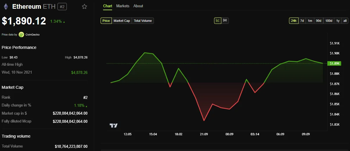 截至发稿时,BeInCrypto数据显示ETH交易价格为1,890美元,过去24小时小幅上涨1.34%。