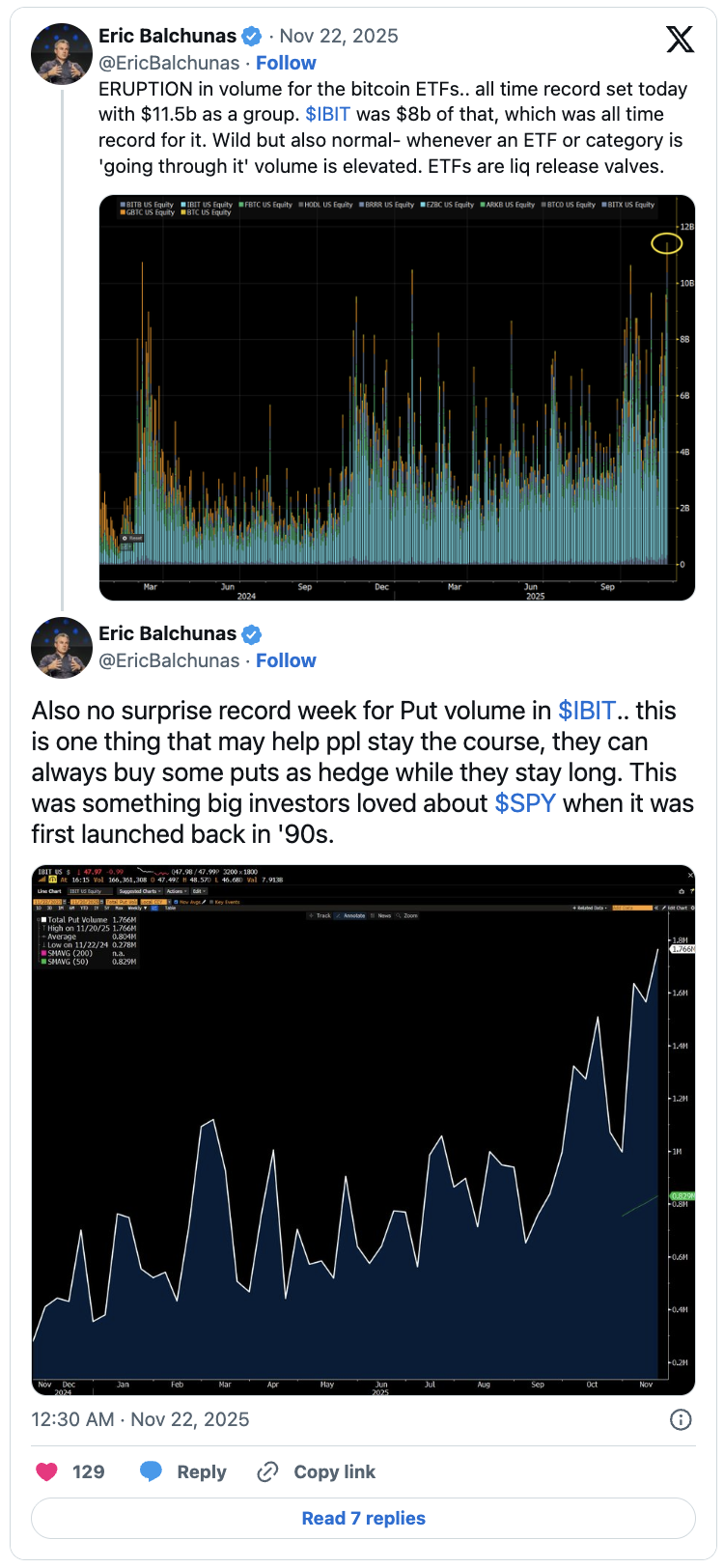 彭博社高级ETF分析师埃里克·巴尔丘纳斯将115亿美元的总交易量称为"爆发性增长"。他指出,在市场波动期间出现此类交易量增长实属正常,因为ETF通常扮演着流动性阀门的角色。其中规模最大的IBITETF占据主导地位,单日交易量达80亿美元,成为当日最活跃的交易产品。