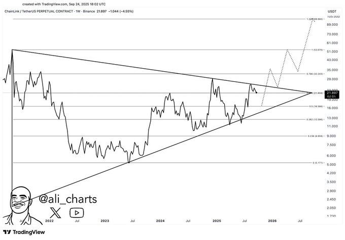 Chainlink的周线图显示出一个持续多年的三角形形态,暗示价格可能突破并迈向100美元大关。若回调至16美元附近,或将在斐波那契支撑位形成理想的筹码积累区。尽管多空比率仍呈现看涨态势,但近期爆仓数据反映出短期波动性和市场拥挤风险。