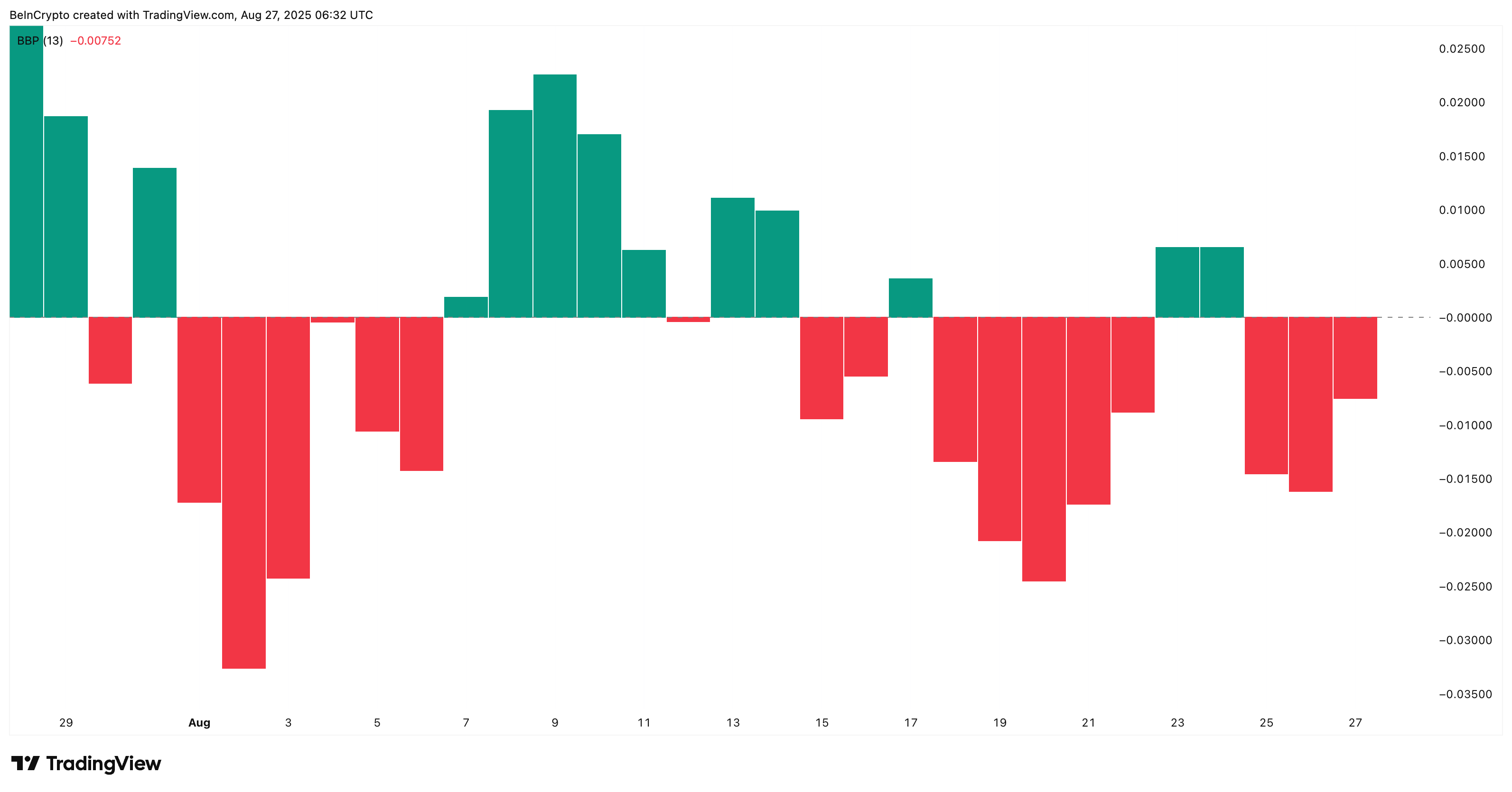 最关键的指标是衡量买卖动能的相对强弱指数(RSI)。通常价格下跌时RSI同步走低,但在8月19日至25日期间,HBAR价格创出更低低点时,RSI却形成更高低点。