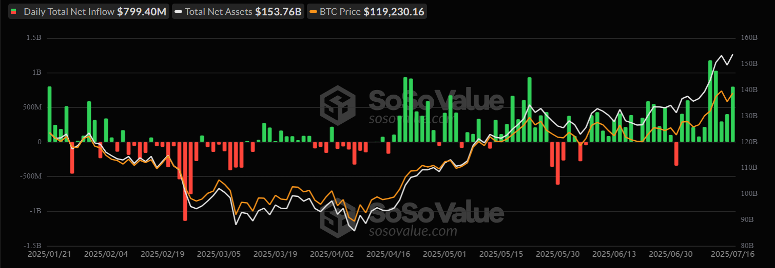 本文撰写时,BTC交易价格维持在11.8万美元上方。本周比特币表现强劲,7月14日创下12.3万美元历史新高。推动因素包括: