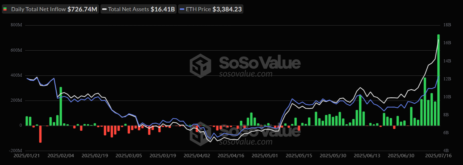 美国ETH ETF连续9日资金净流入,7月16日单日流入创7.26亿美元纪录。截至7月16日,ETH ETF总资产管理规模达164亿美元,累计净流入超64亿美元。