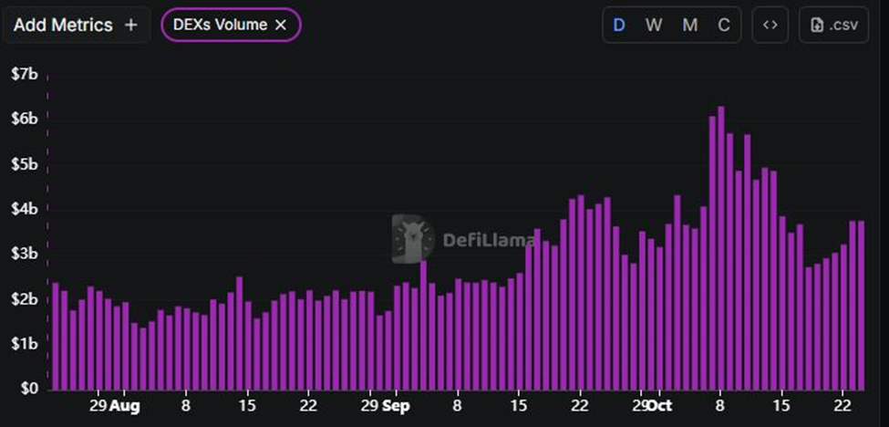 虽然政治赦免带来短期刺激,但BNB近期上涨另有支撑。数据显示,BNB链DeFi活动过去7天明显回暖:10月18日DEX交易量跌至27.3亿美元月内低点后持续回升,最近24小时已飙升至37.6亿美元,创本周新高。