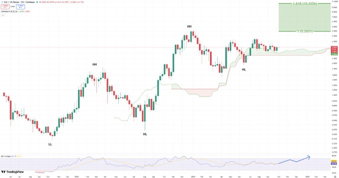 SUI市场情绪明显转向乐观。交易活动保持活跃,当前形态暗示可能正在构筑新的高点。若买盘能持续维持在3.7美元上方,后续或将挑战5.5美元阻力区域。无论从趋势结构还是链上数据来看,多头仍掌握市场主导权。