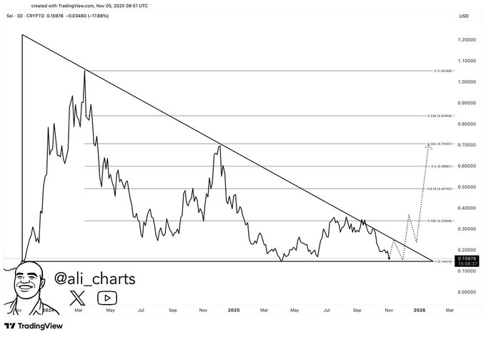 分析师Ali(@ali_charts)分享的最新图表显示,SEI处于下降三角形形态内,正向着0.10-0.12美元附近的X轴压缩。该区域既是支撑基底,也是多空双方博弈的交汇点。历史数据显示,当市场压力释放时,此类形态往往预示着剧烈波动。若SEI维持当前轨迹,该区域可能成为向上突破的跳板。