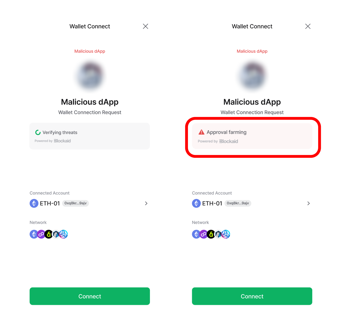 我们的实时诈骗检测系统专为保护用户在签署交易、连接或批准前的关键脆弱时刻而设计。这些保护措施直接内置于钱包中,在以下场景自动触发: